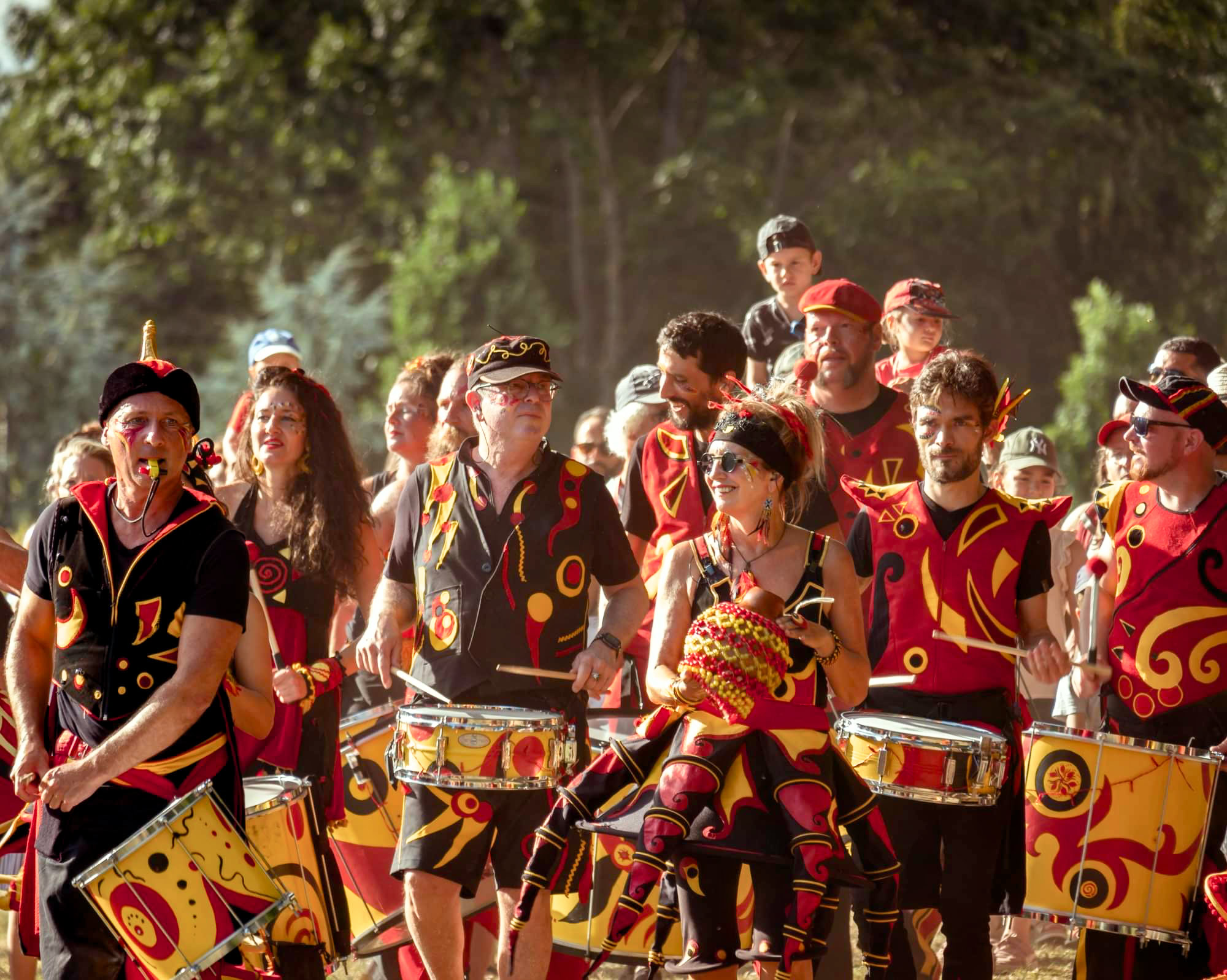 Aujourd’hui, nous vous proposons un spectacle avec une quinzaine de percussionnistes aux magnifiques costumes noirs, rouges et jaunes, jouant des rythmes traditionnels brésiliens tels que le Samba, le Samba Reggae, le Partido Alto, l’Afôxé, le Maracatu, mais aussi des versions plus groove et plus funky de certains de ces rythmes. Ce qui a valu quelquefois à Capharnaüm le surnom de batuk hip hop !